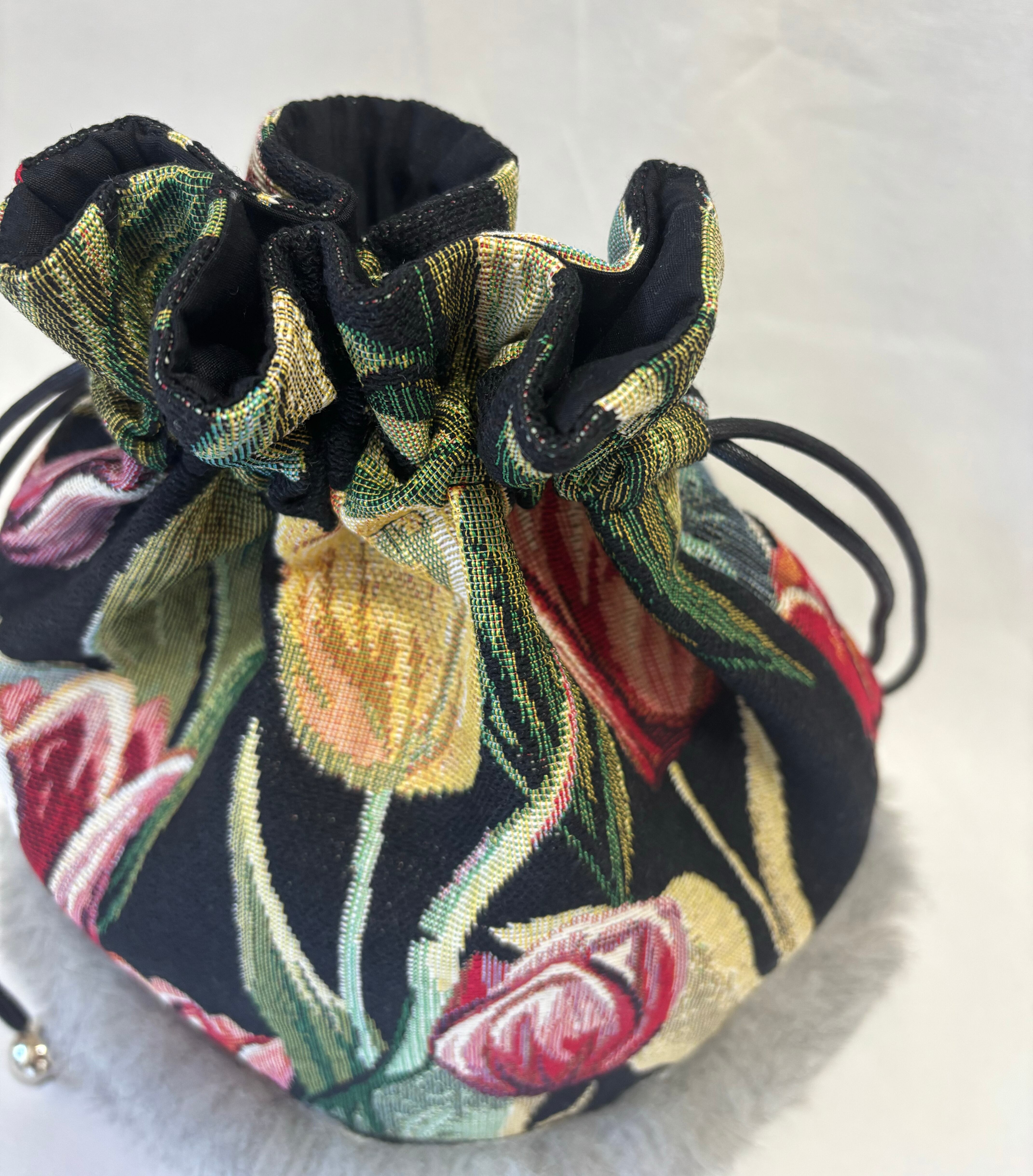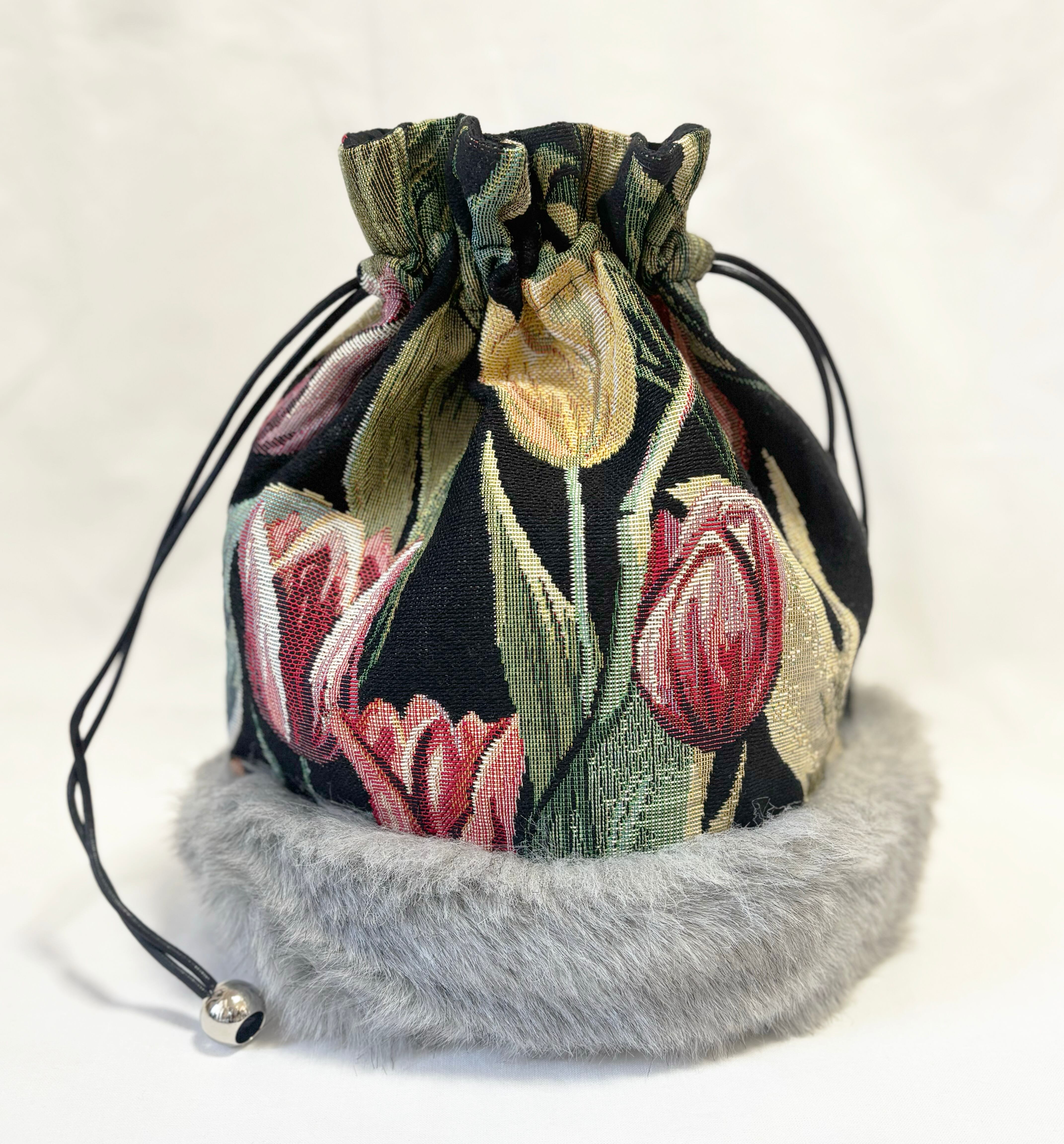 チューリップ柄にふわふわのフェイクファーを組み合わせ、秋冬らしく仕立てました。