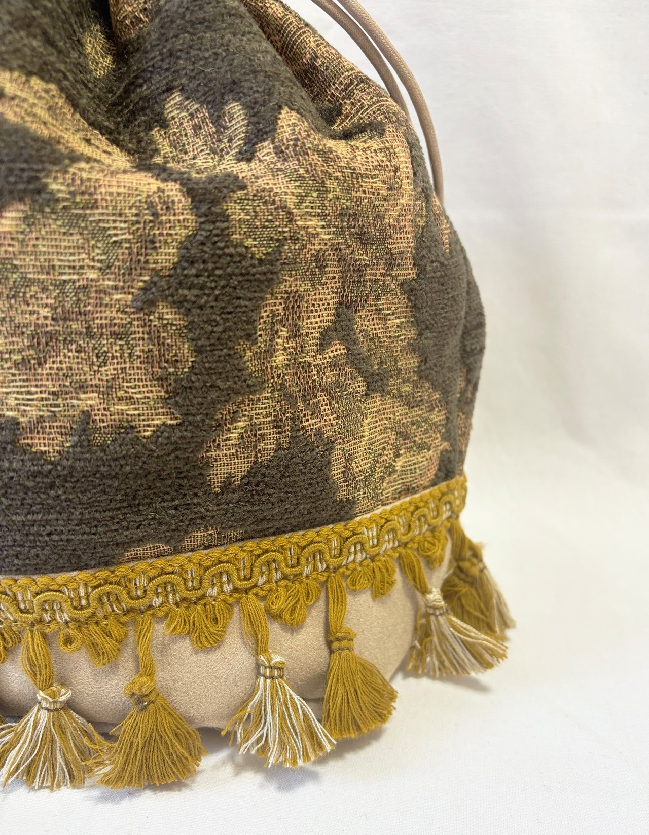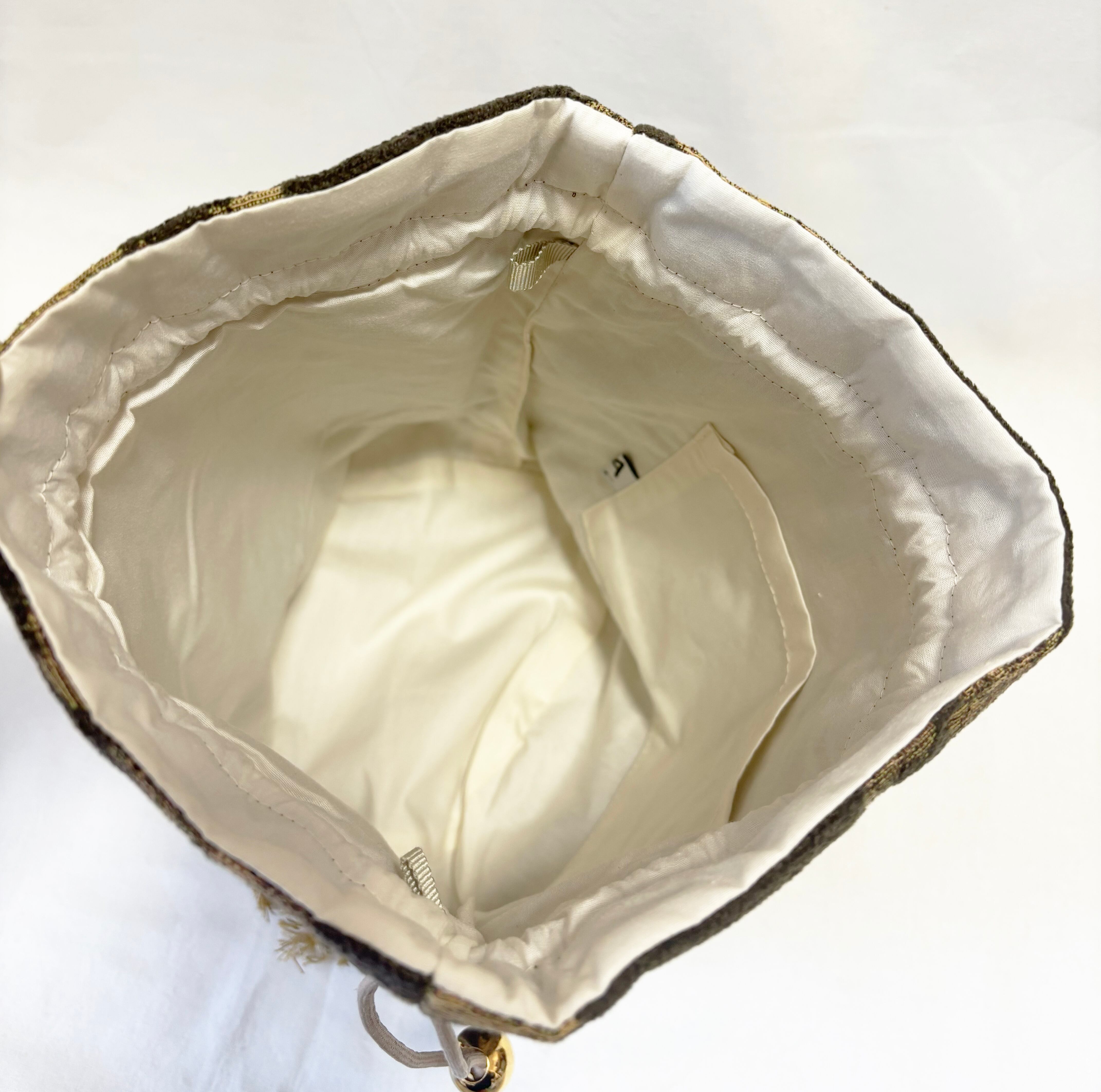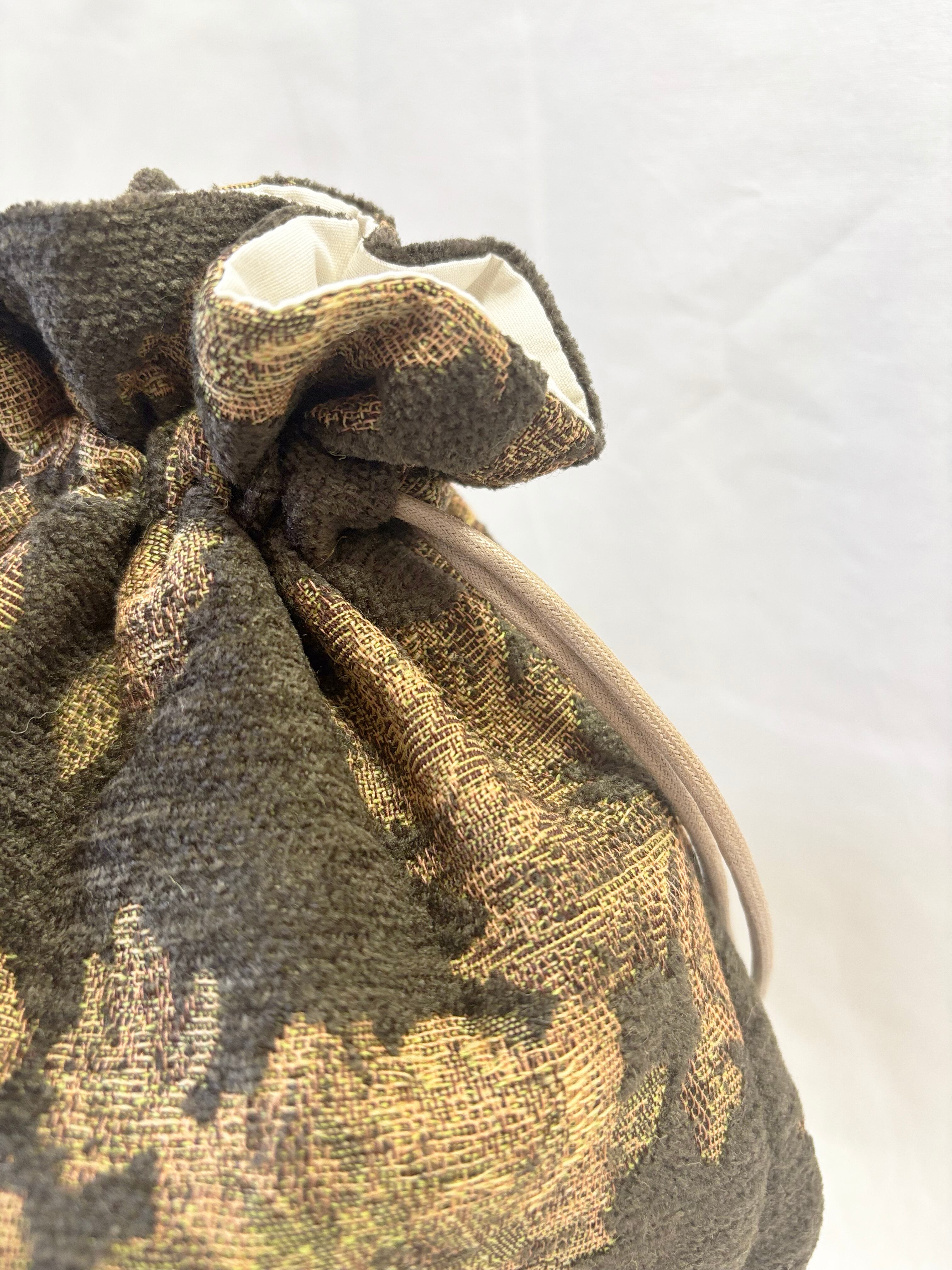 ブラウンのアンティークフラワー柄が魅力的な巾着バッグ。
