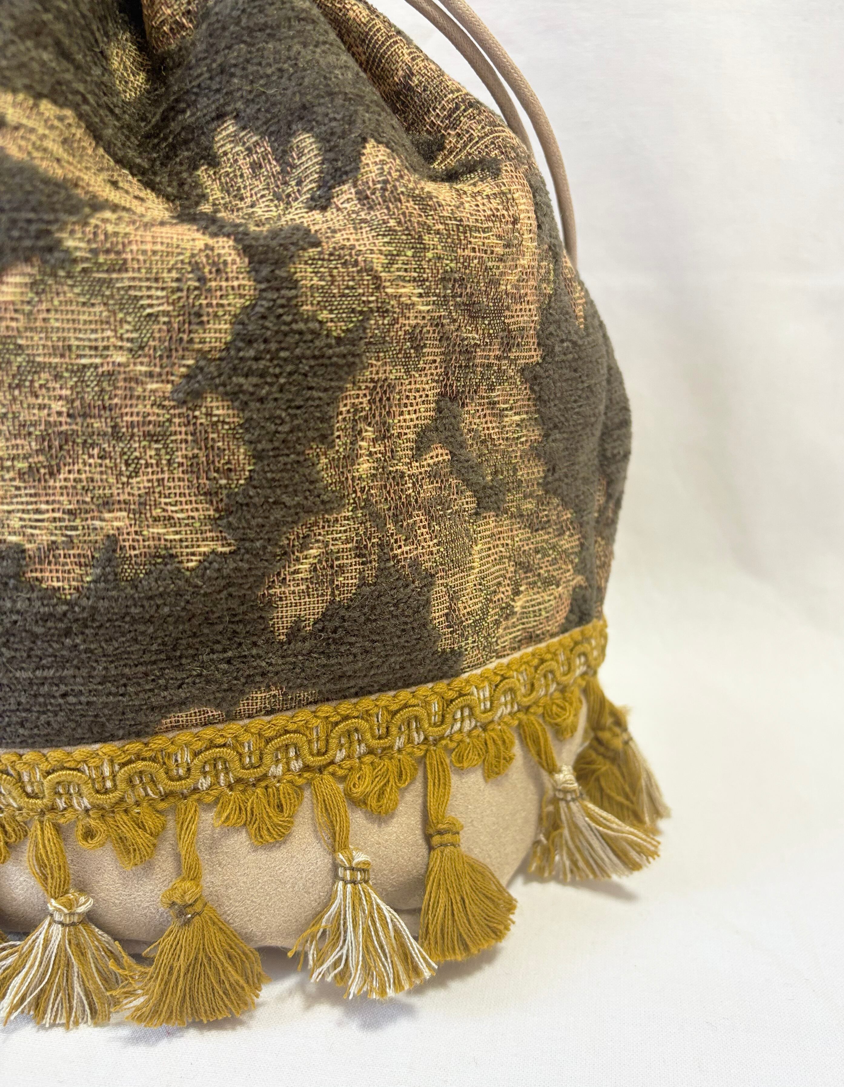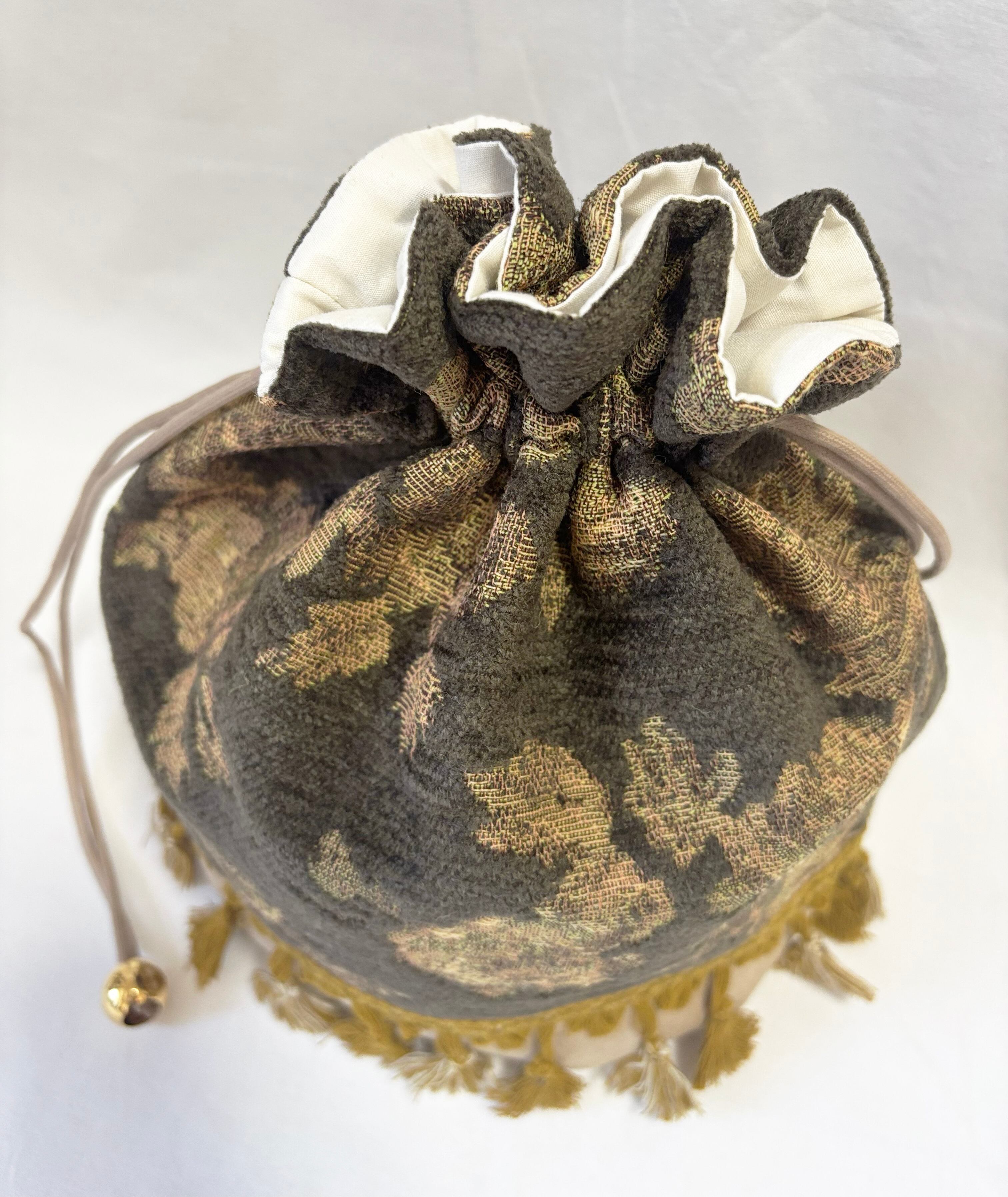 This drawstring bag features an attractive brown antique flower pattern.