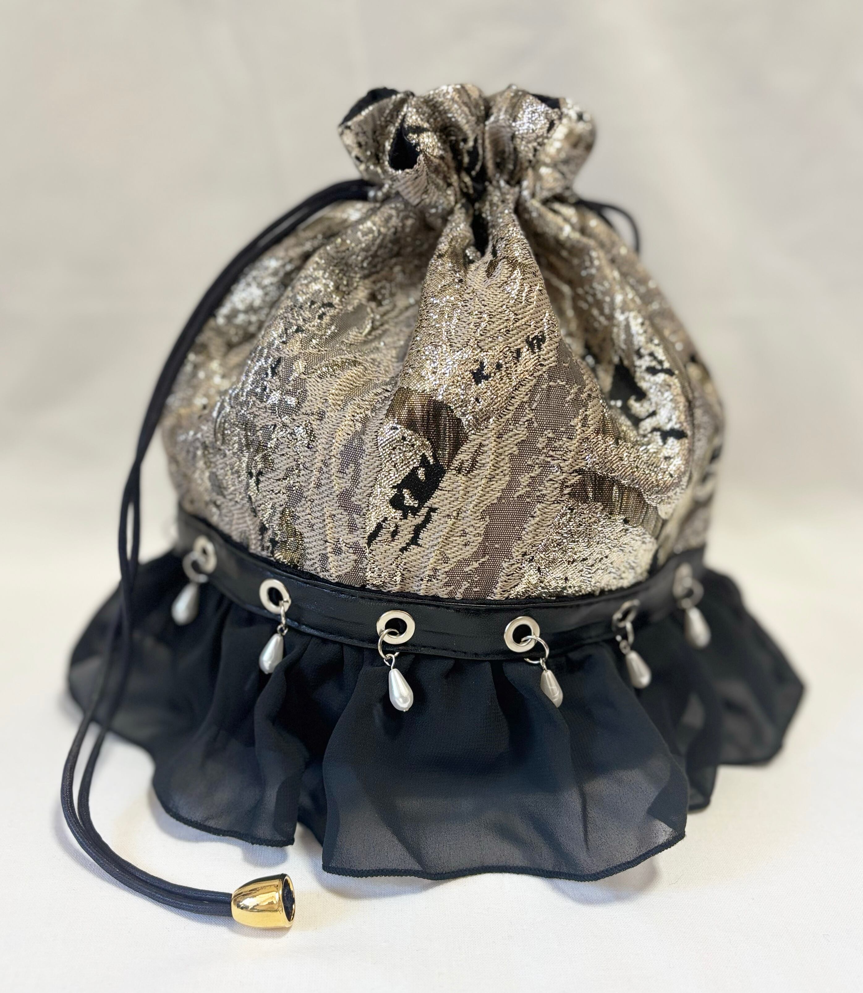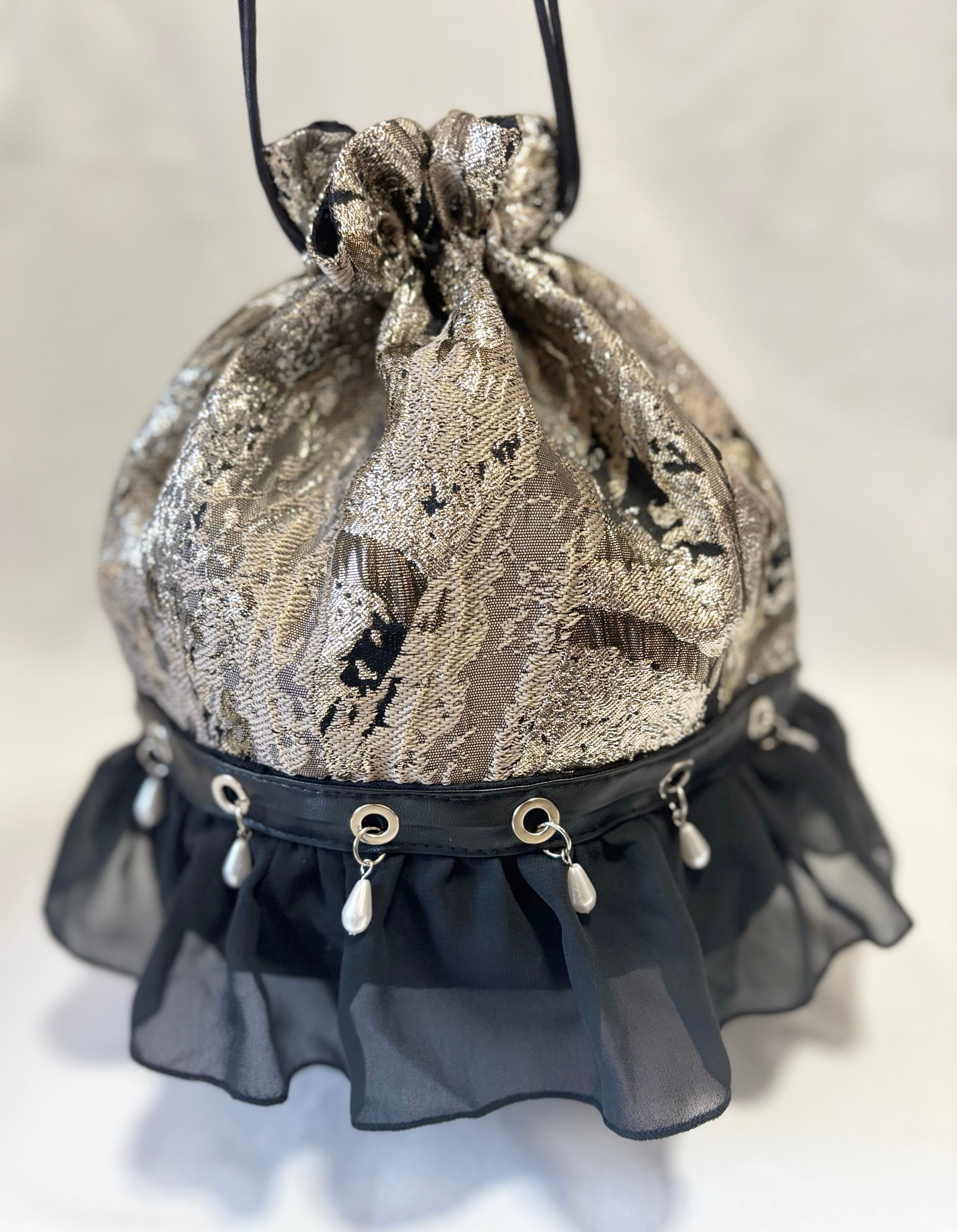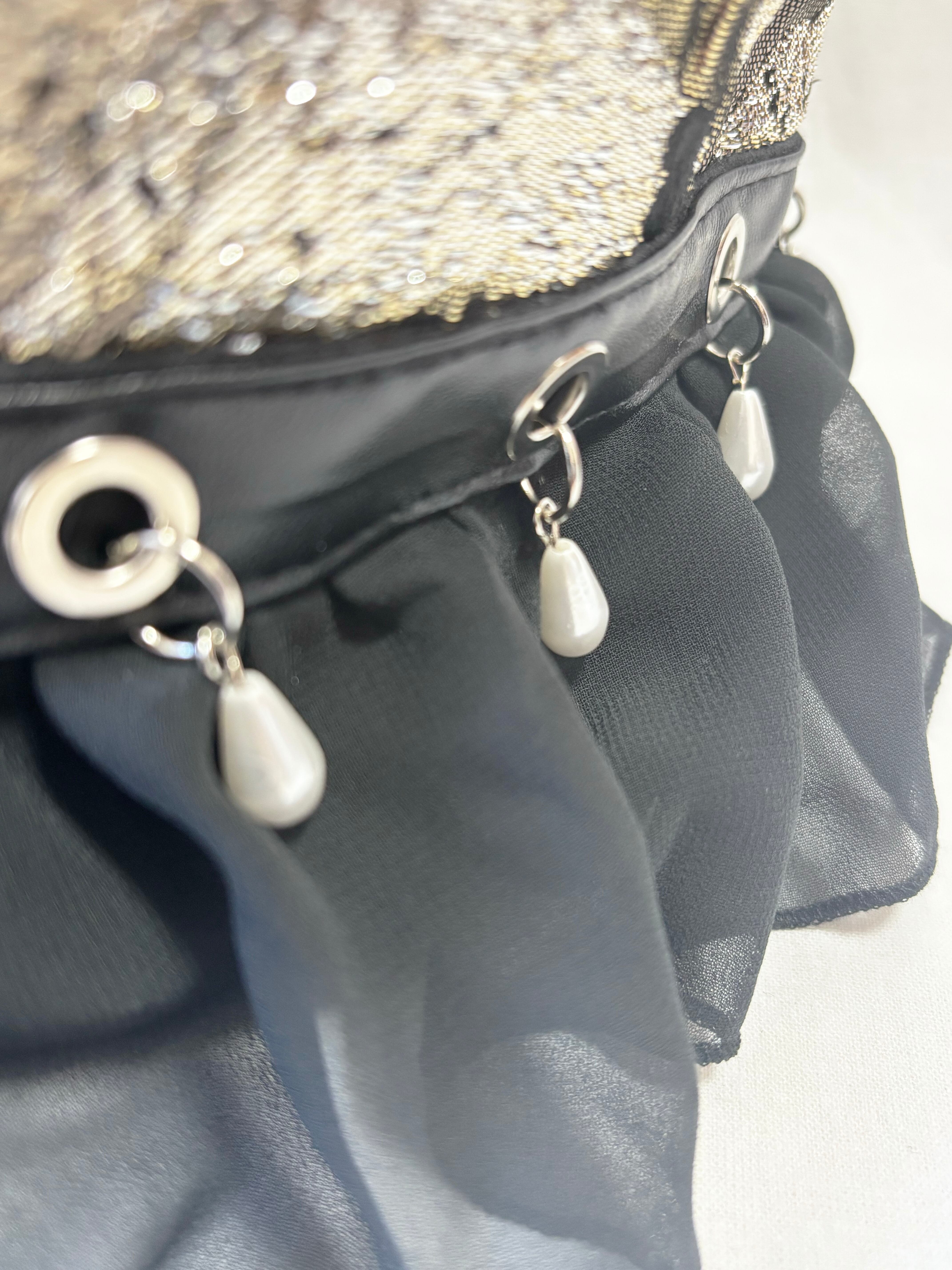 The black chiffon ruffles are adorned with teardrop-shaped pearl charms attached to metal holes.
