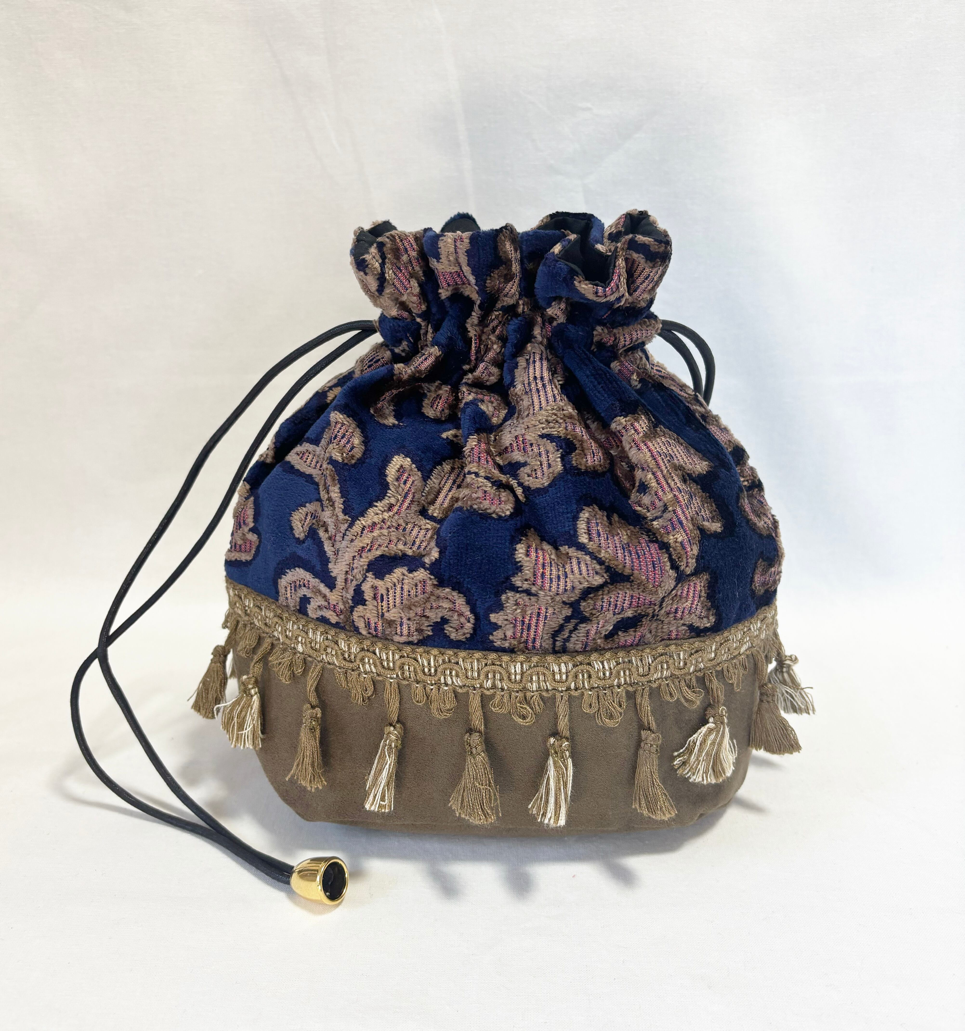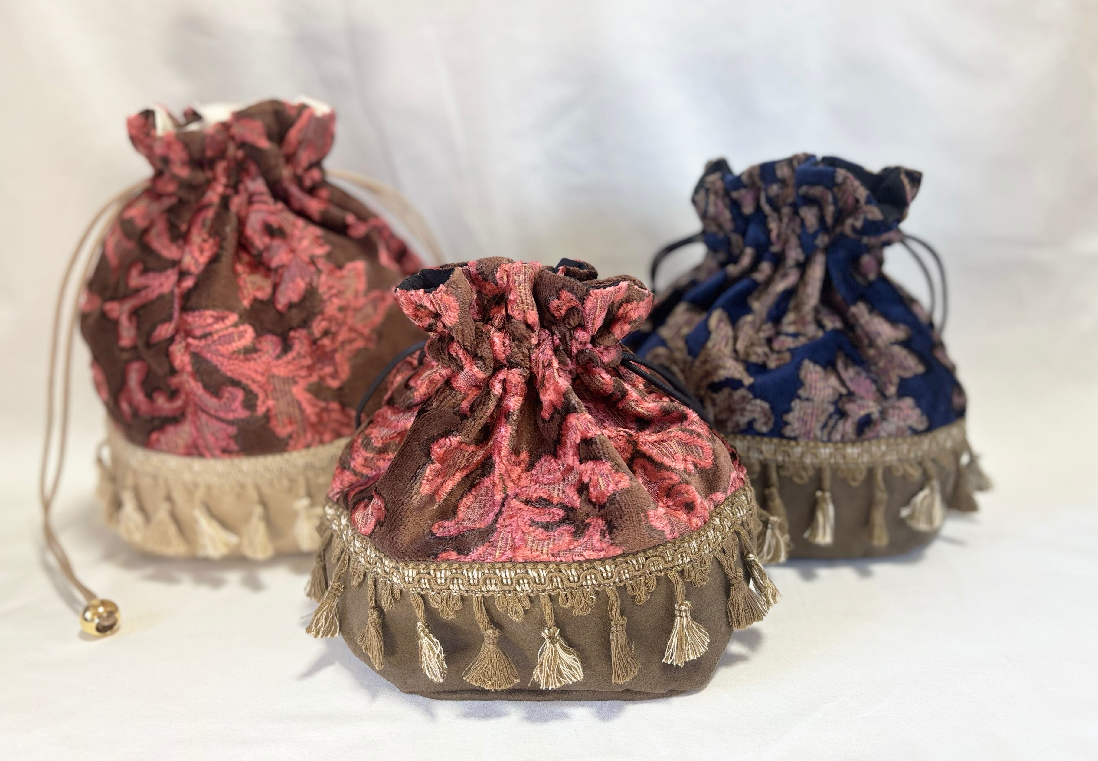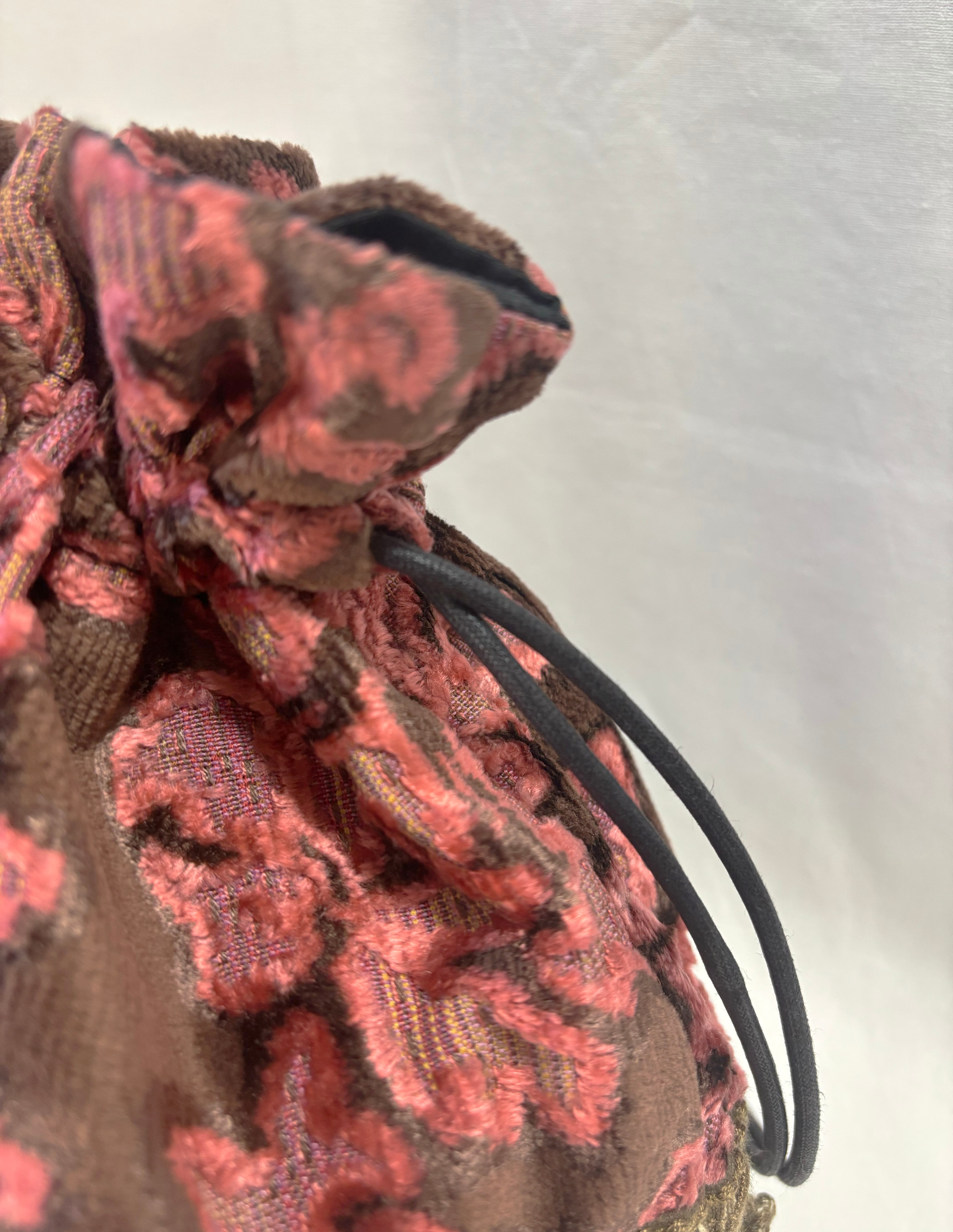 華やかなボタニカル柄のベルベットジャガード生地とスエード生地の巾着バッグ。