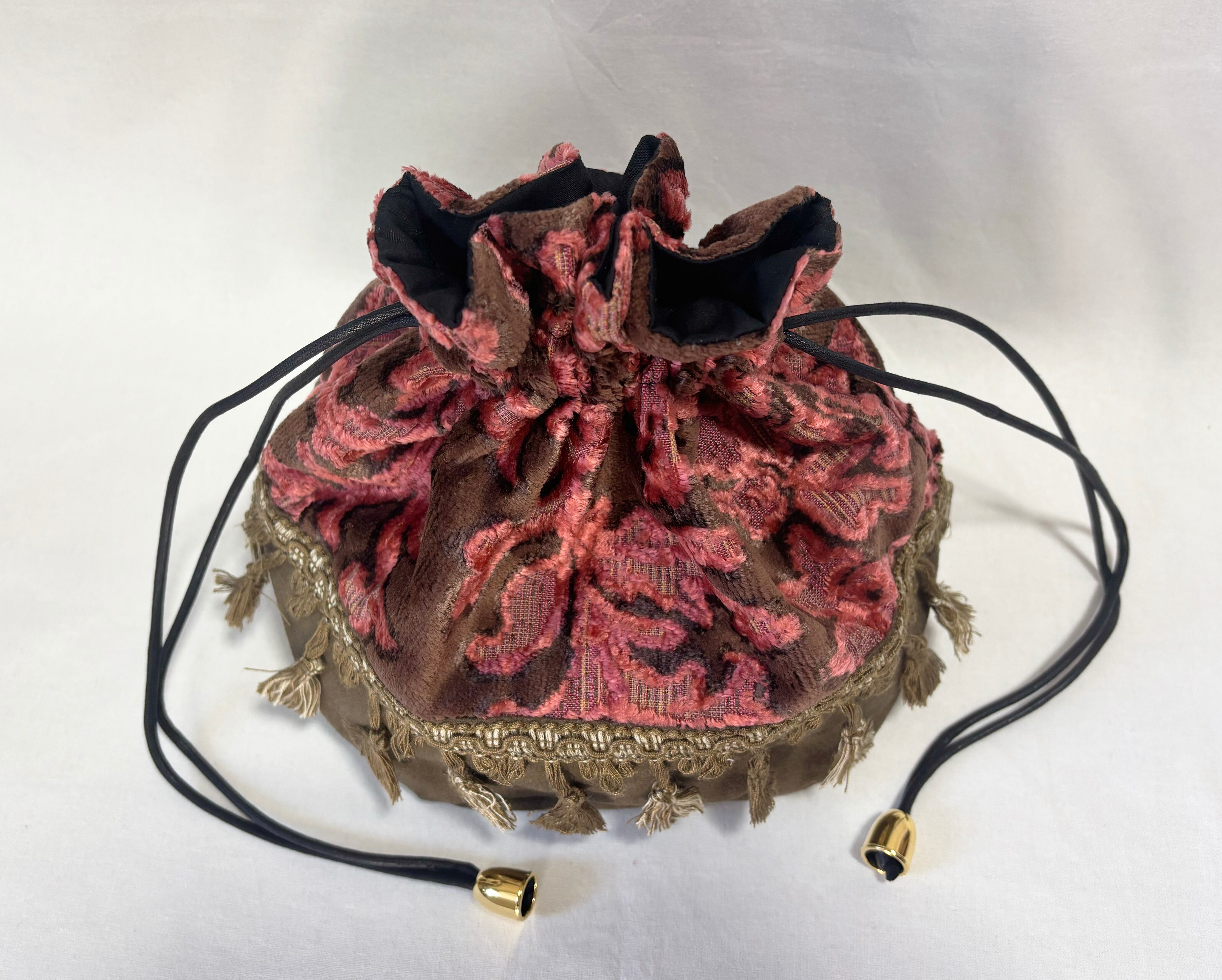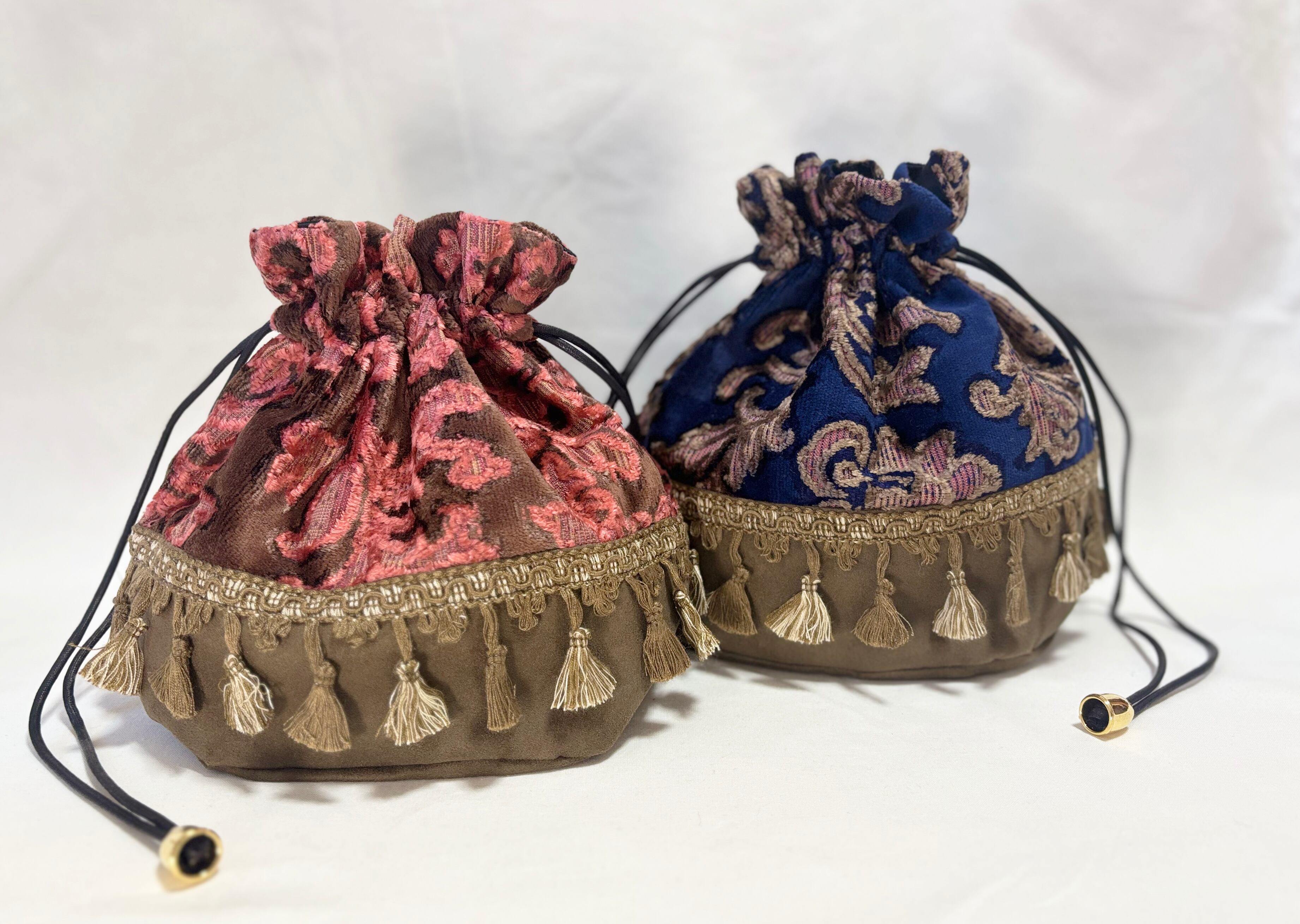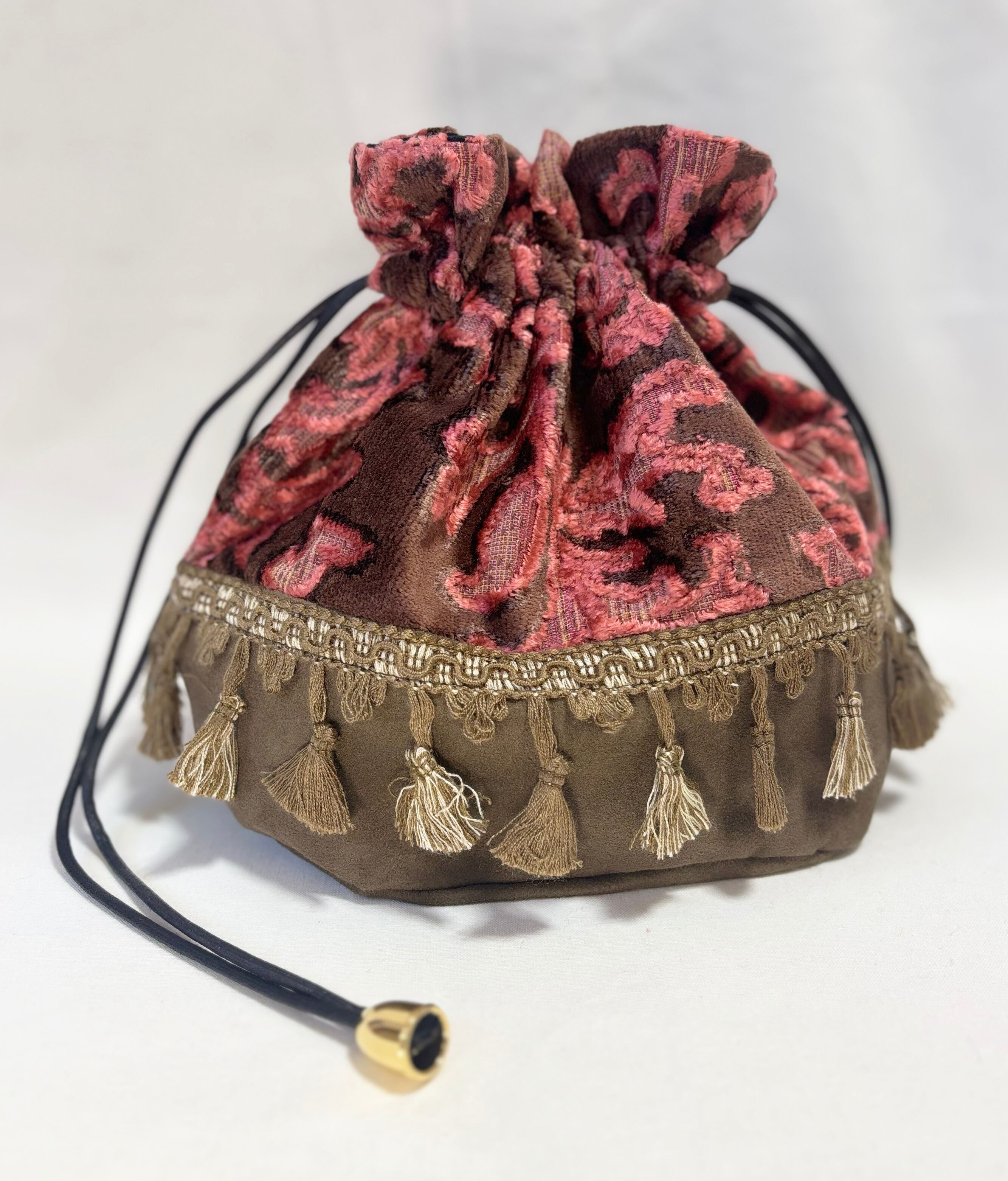 華やかなボタニカル柄のベルベットジャガード生地とスエード生地の巾着バッグ。