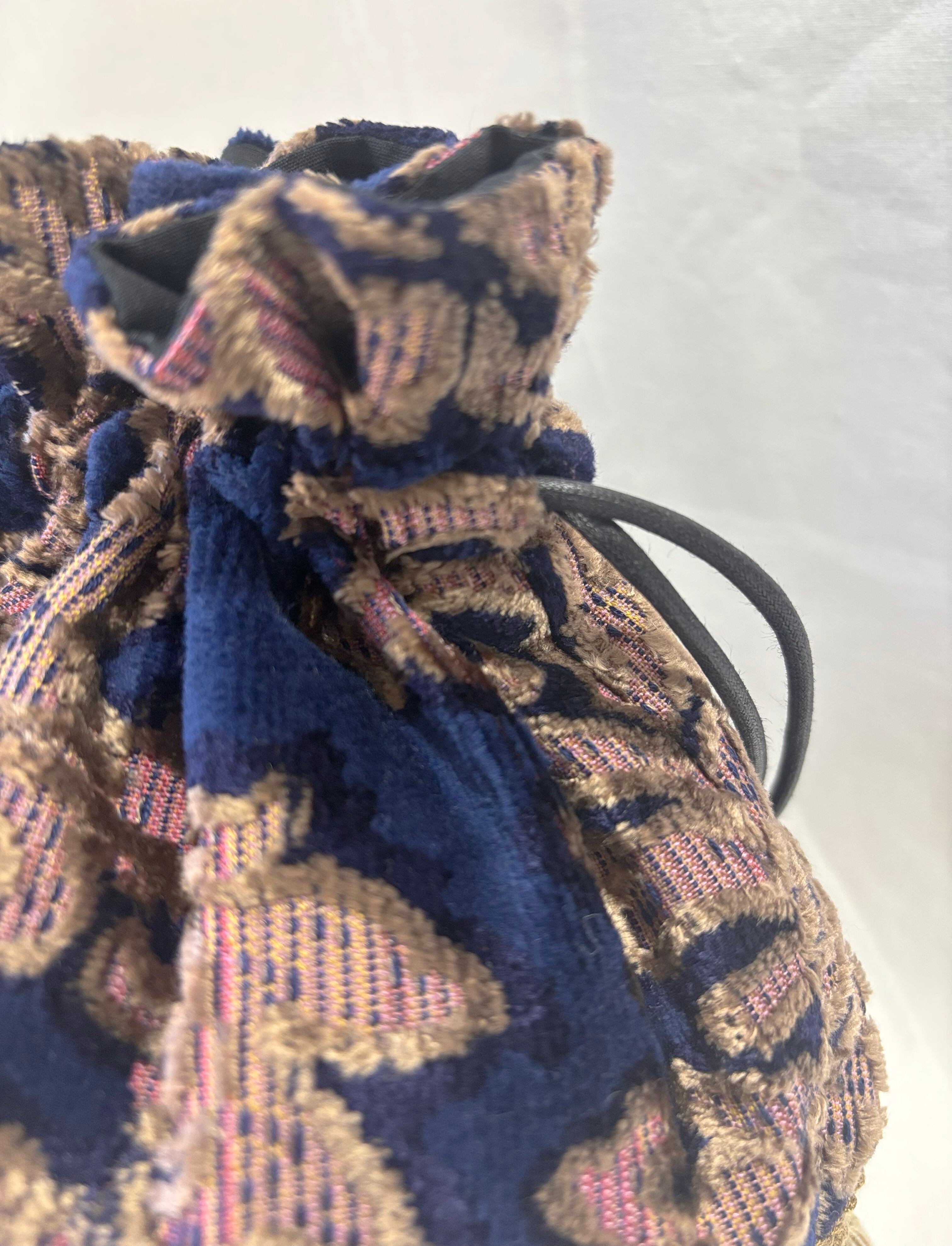 This drawstring bag is crafted from velvet jacquard and suede fabric with a gorgeous botanical pattern. Its classic, luxurious feel can be toned down for a more casual look, expanding the range of outfits you can wear.