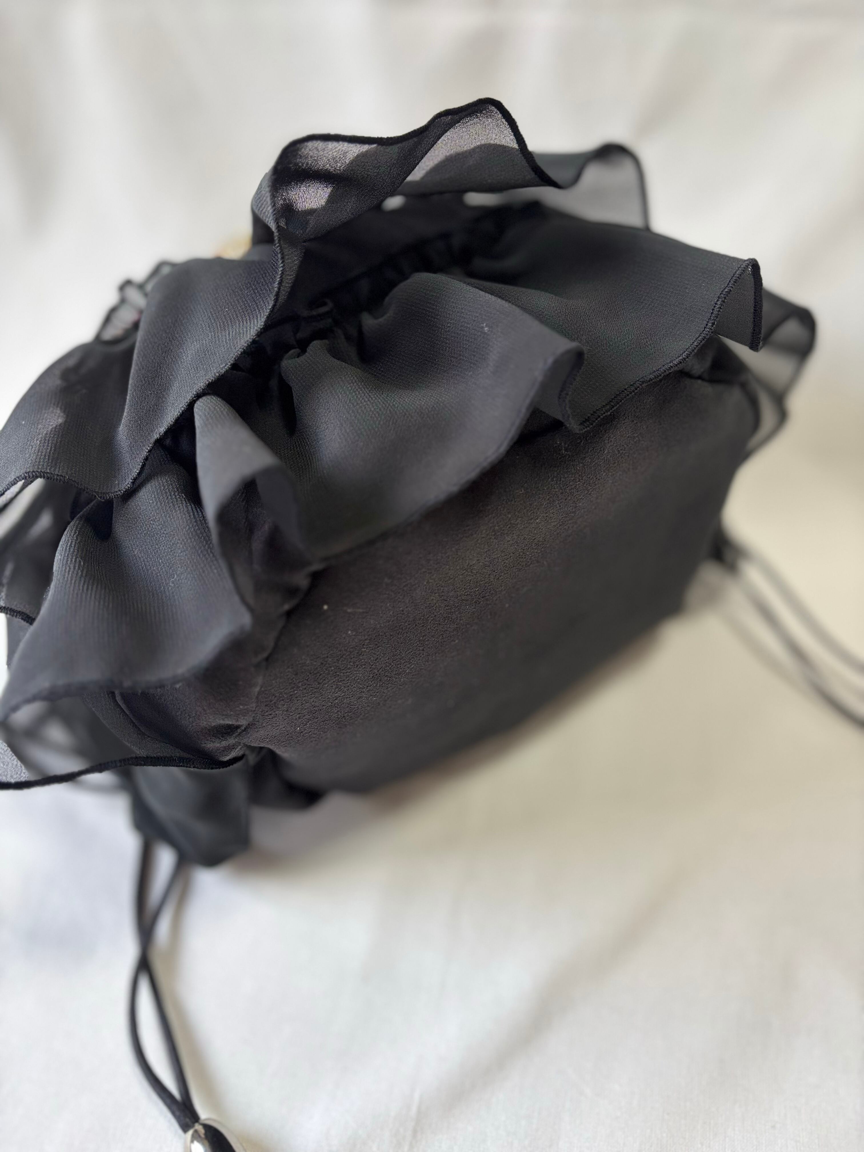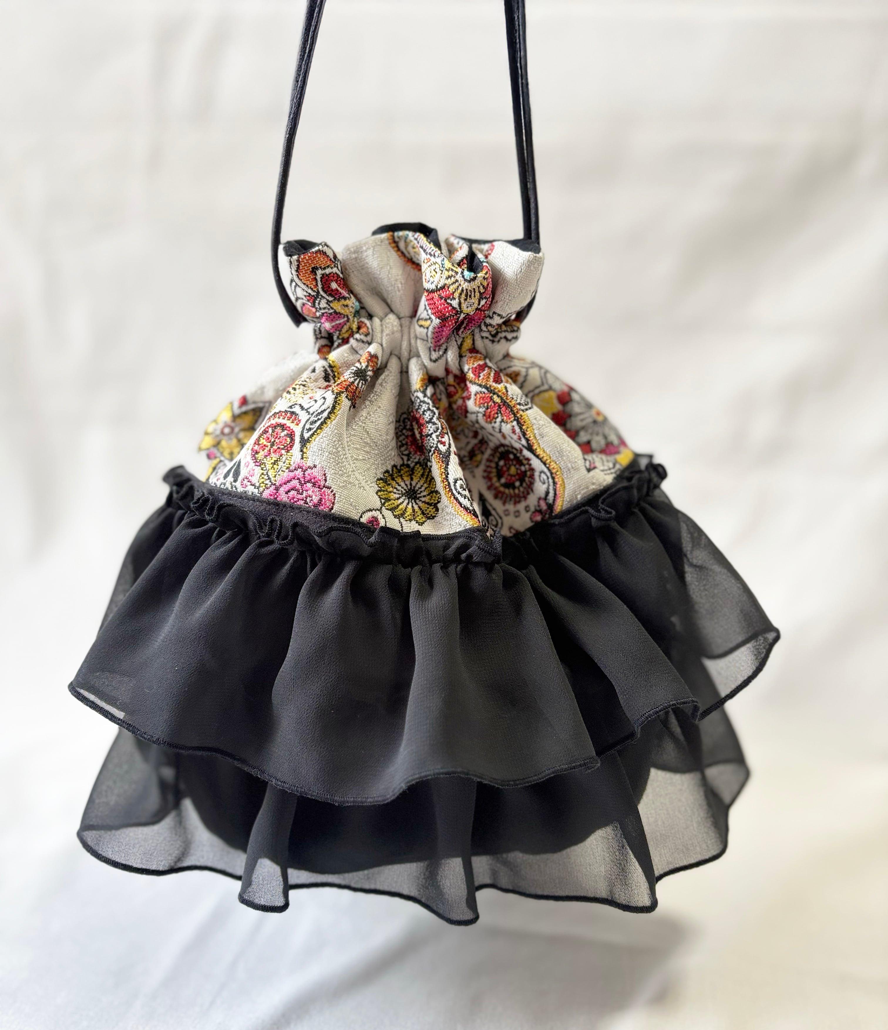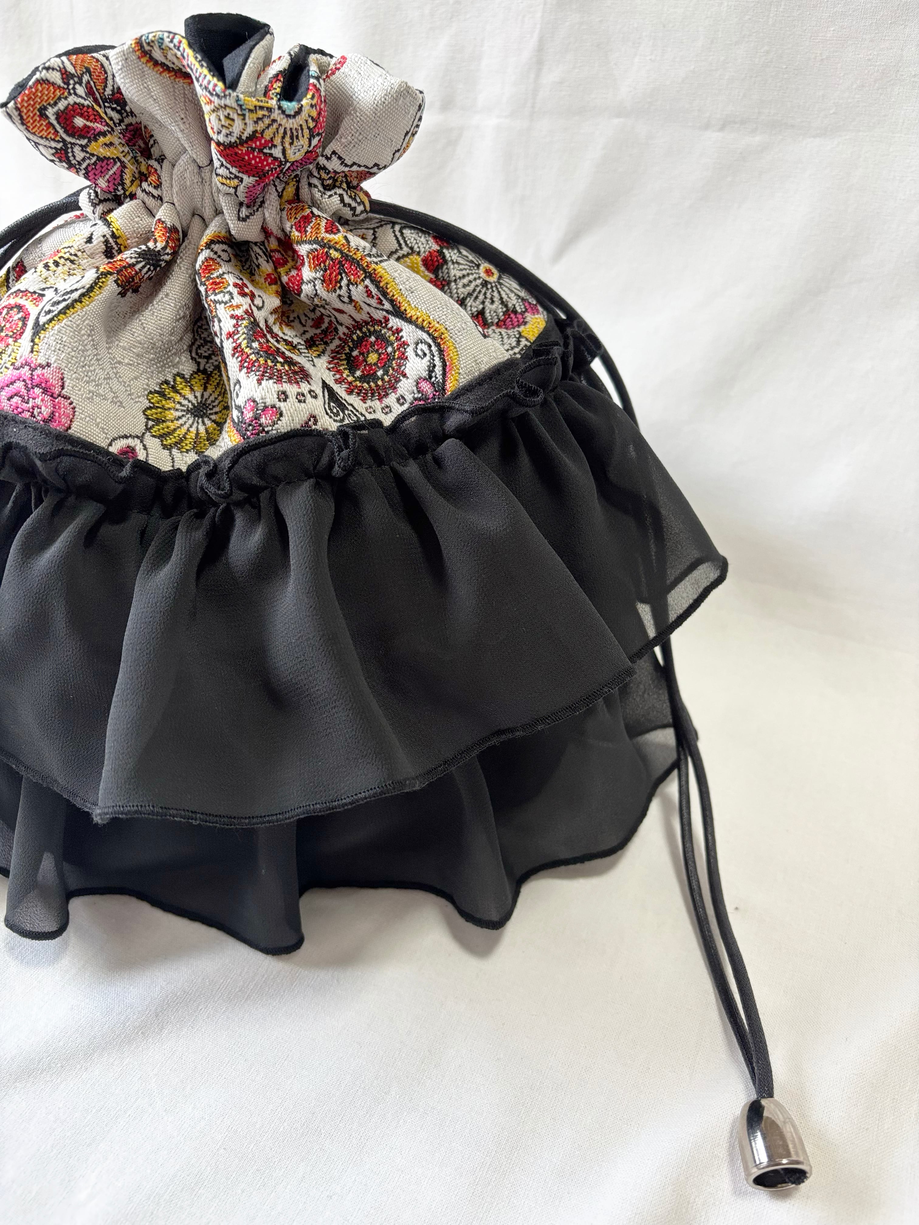 目を引くスカルのテキスタイルに、透け感のあるブラックシフォンのフリルをたっぷりとあしらいました。