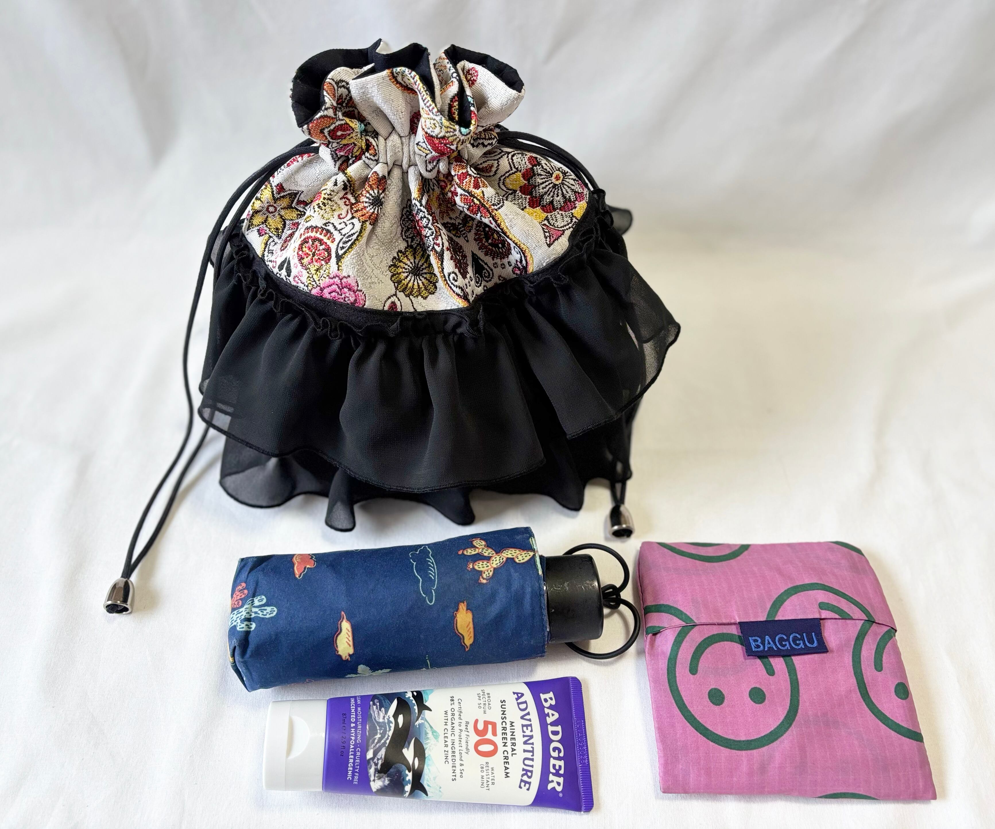 Despite its small design, this handy drawstring bag can easily hold a long wallet, folding umbrella, 500ml water bottle, and more. It maintains its cute, round shape even when carrying only a small amount of items.